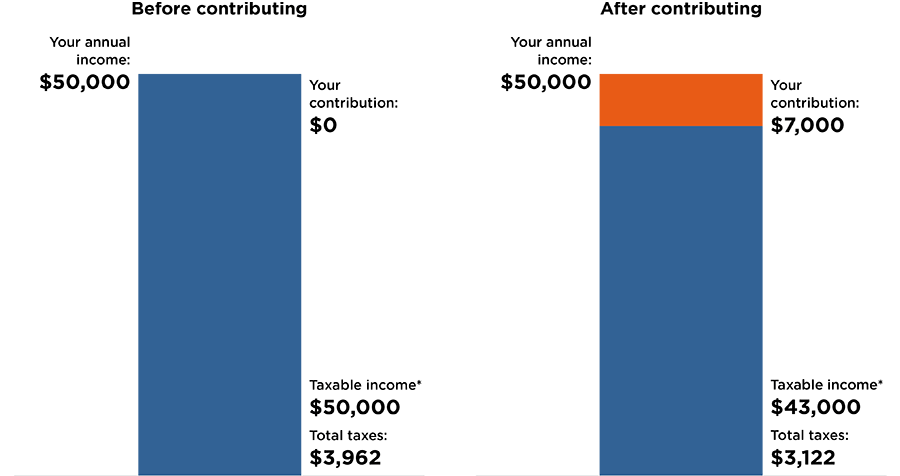 In this example, your retirement account contributions reduce your annual income taxes by $840. You benefit by investing in your future and are rewarded with lower taxes today.